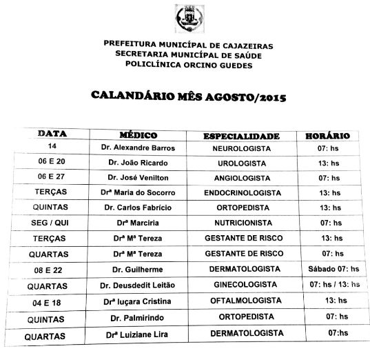 O calendário é referente ao mês de agosto 2015 e os médicos