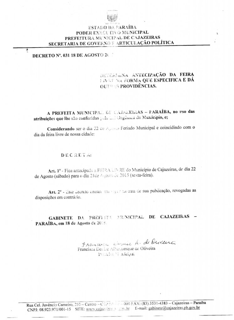 A prefeita de Cajazeiras, Denise Albuquerque através de decreto, determinou que a Feira Livre do município será antecipada e acontecerá nessa sexta-feira (21 de agosto) e não no sábado, como de costume.