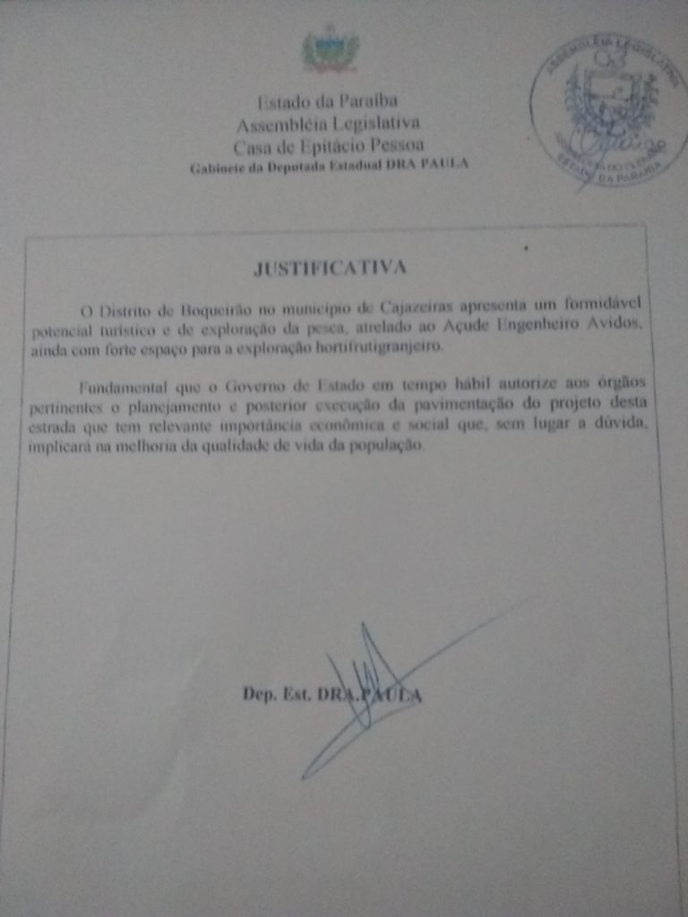 Autora do requerimento nº 864, de 28 de março deste ano, em que solicita ao Governador João Azevêdo “a pavimentação asfáltica que liga a BR-230 ao Distrito de Boqueirão, município de Cajazeiras-PB”, a deputada sertaneja fundamentou seu pedido lembrando que “o Distrito de Boqueirão, no município de Cajazeiras, apresenta formidável potencial turístico e de exploração de pesca, atrelado ao Açude Engenheiro Avidos, ainda com forte espaço para a exploração hortifrutigranjeiro.”