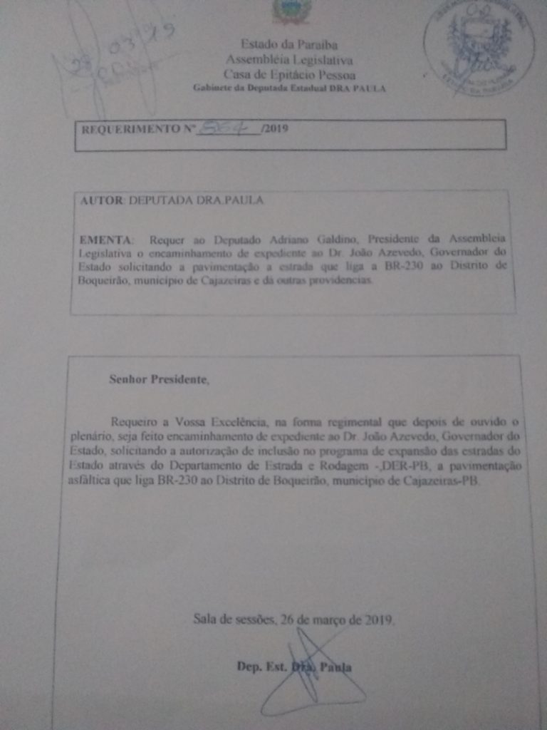 A deputada estadual licenciada Dra. Paula (PP) revelou hoje sua satisfação em relação ao início do processo que culminará com o asfaltamento da estrada que liga o Distrito de Boqueirão de Piranhas (Cajazeiras) à BR-230.