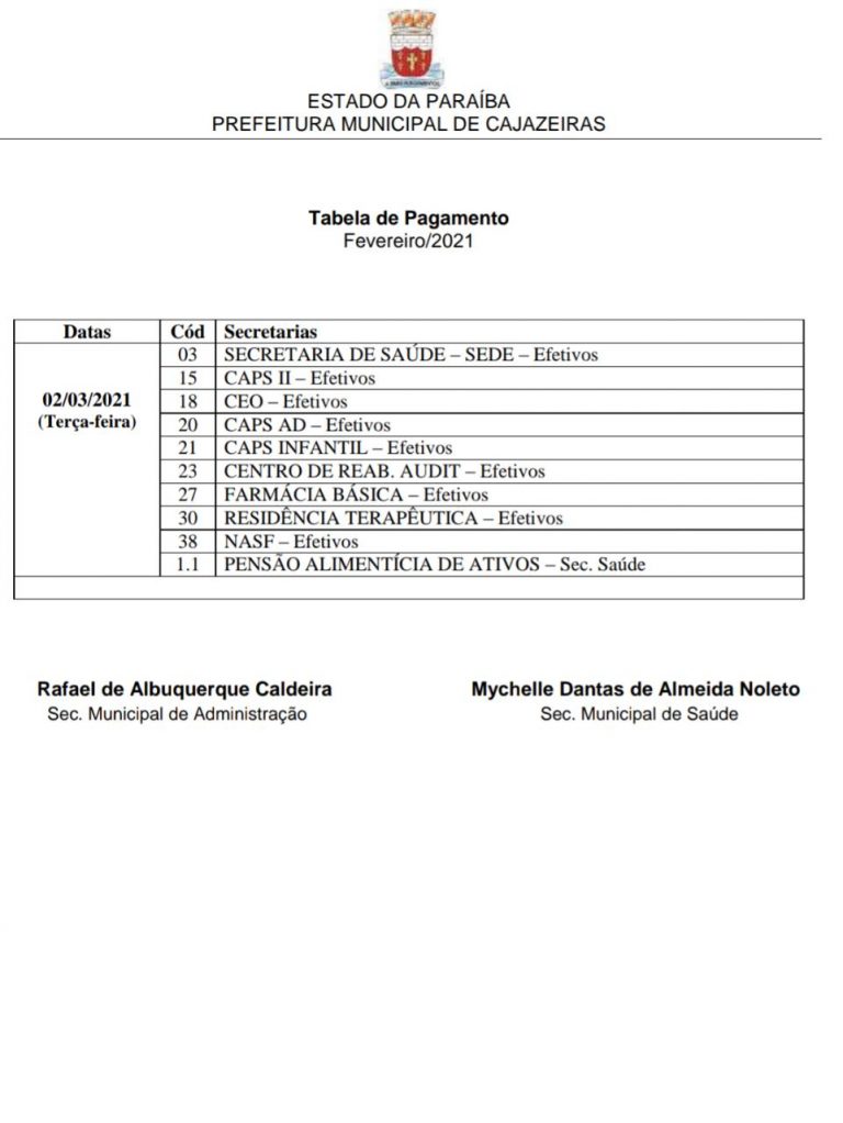 Prefeitura Municipal de Cajazeiras anuncia tabale de pagamento dos servidores. Confira!