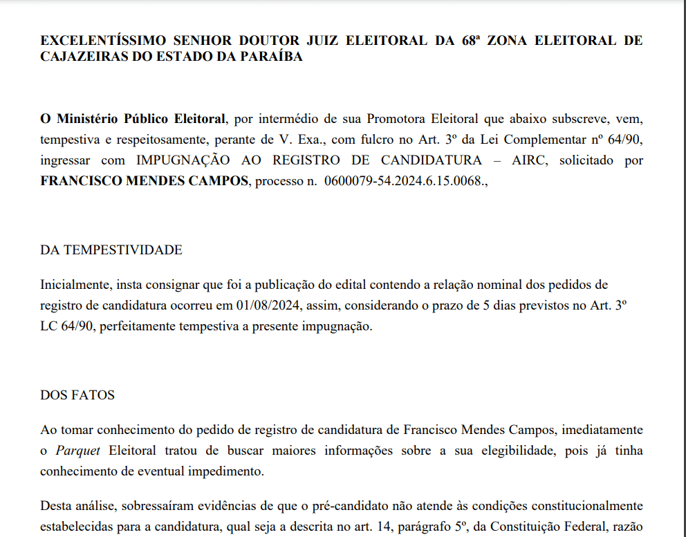 caba de sair o pedido de indeferimento da candidatura do deputado estadual Chico Mendes (PSB), como concorrente ao cargo de prefeito de Cajazeiras nas próximas eleições.