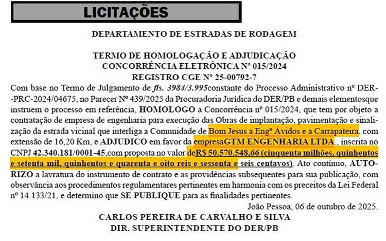 A rodovia, que passará por uma extensão de 16,2 km, contará com implantação, pavimentação e sinalização, beneficiando diretamente as comunidades de Boqueirão, Bom Jesus e Engº Ávidos, além de facilitar o acesso à região de Carrapateira. Segundo o DER/PB, a publicação do contrato e demais providências seguem os trâmites legais estabelecidos pela Lei Federal nº 14.133/21, aguardando agora apenas a ordem de serviço para o início das obras.