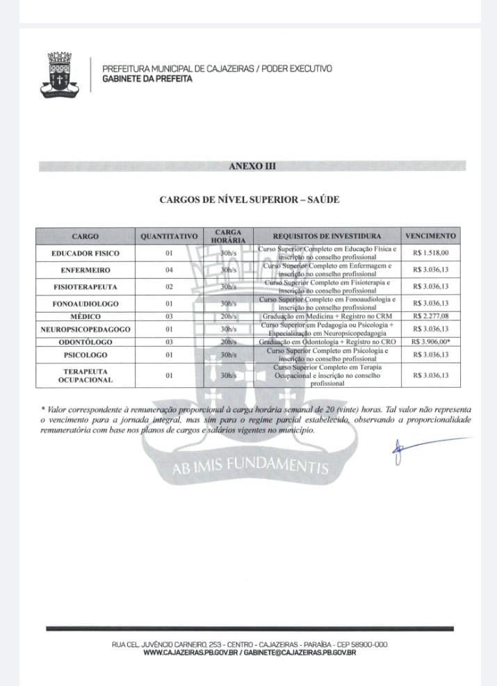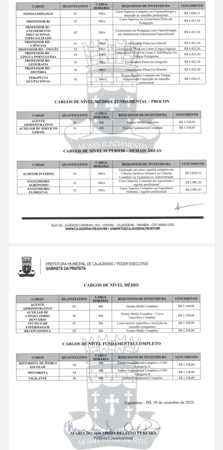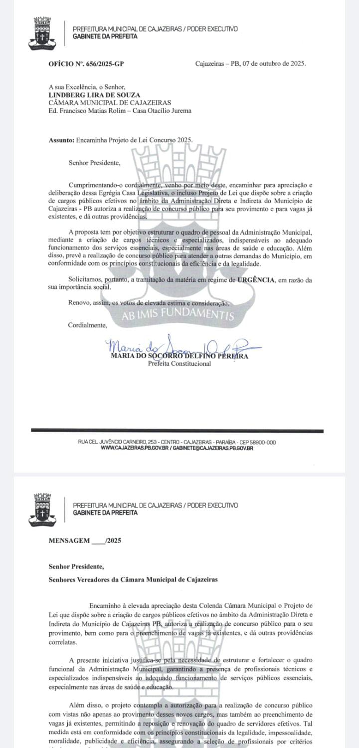 OPORTUNIDADE: Prefeito de Cajazeiras Socorro Delfino (PP), envia para Câmara Municipal Projeto de Lei que dispõe sobre criação de cargos públicos efetivos no âmbito da Administração Direta e Indireta do Município autorizar a realização de concurso público.