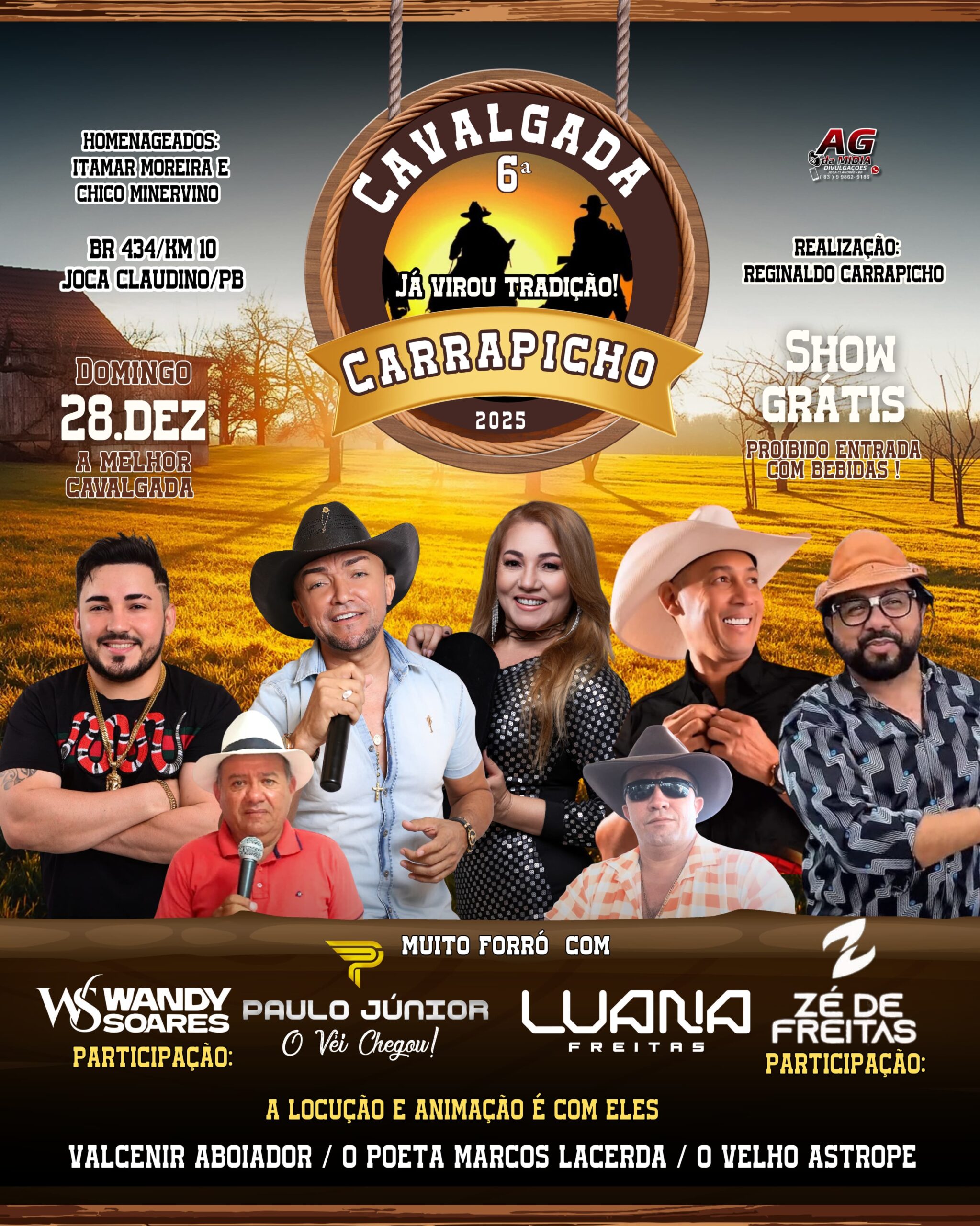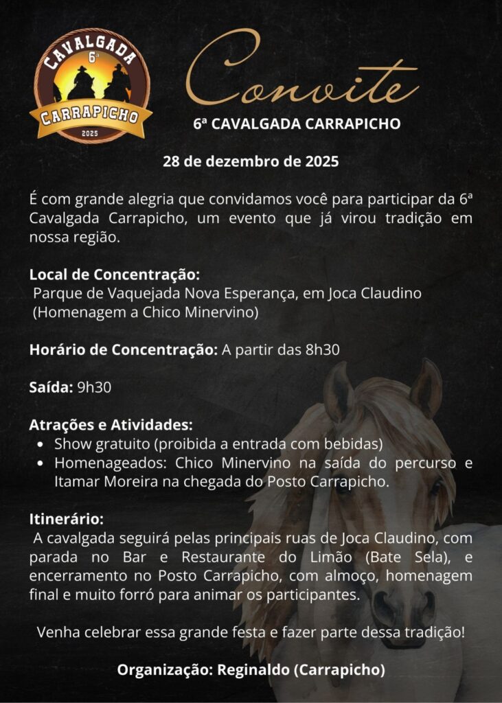 A tradição está de volta na região da cidade de Joca Claudino, o organizador do evento Reginaldo (Popularmente conhecido por Carrapicho), está convidando toda região para participar da 6º Edição da Cavalgada Carrapicho, evento tradicional em Joca Claudino no dia 28 de dezembro 2025.